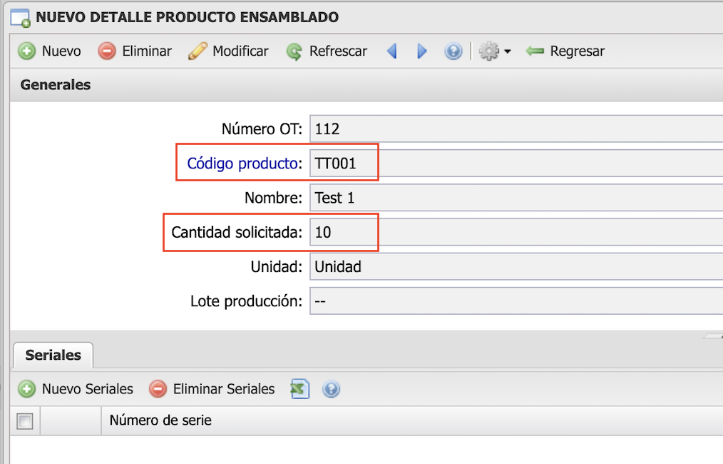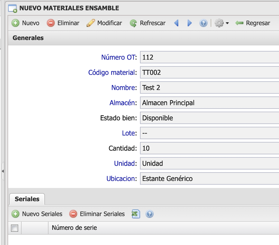 Opcional: En la pestaña inferior se podrán agregar los seriales del producto terminado en caso de que se requiera.