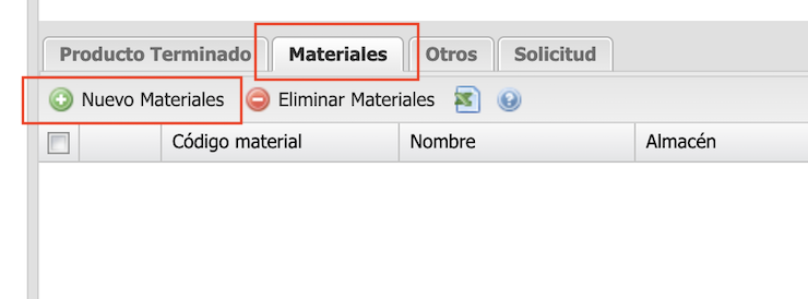 6. Hacer click en "Nuevo Materiales" en la pestaña "Materiales" para agregar los materiales requeridos para producir el producto terminado seleccionado en el punto anterior.
