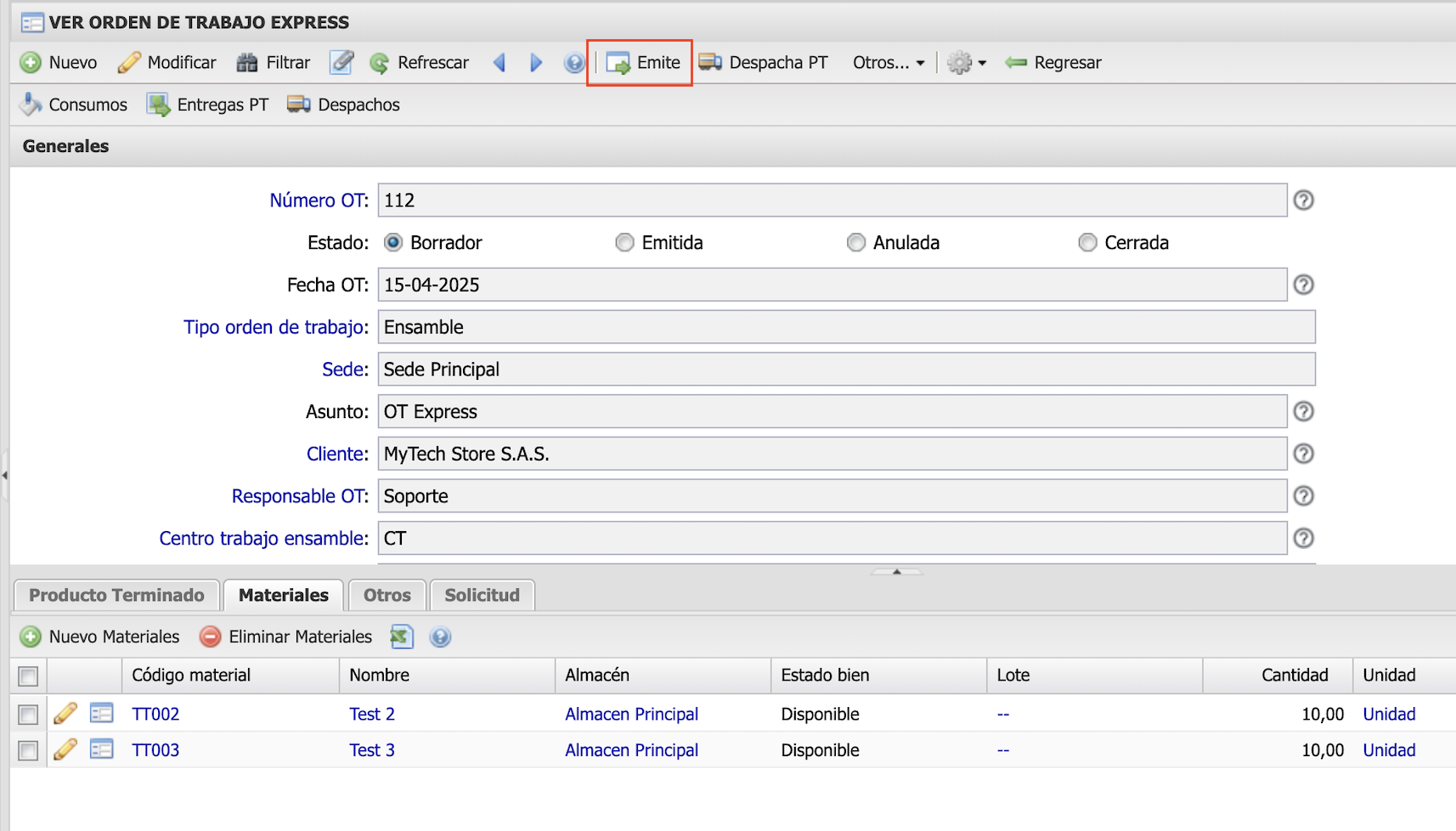 Al momento de emitir, el sistema generará de forma automática los consumos de cada material y hará la entrega del producto terminado en el almacén y ubicación del centro de trabajo seleccionado.