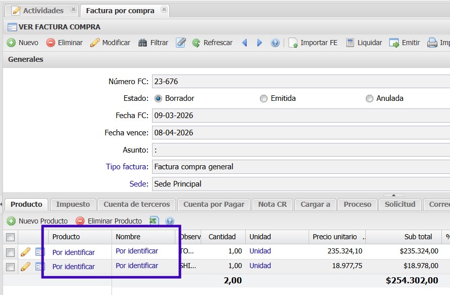 En algunos casos, el sistema puede no encontrar una coincidencia adecuada para una línea de la factura importada. Cuando esto ocurra, asignará el código de producto Por identificar a esa línea: