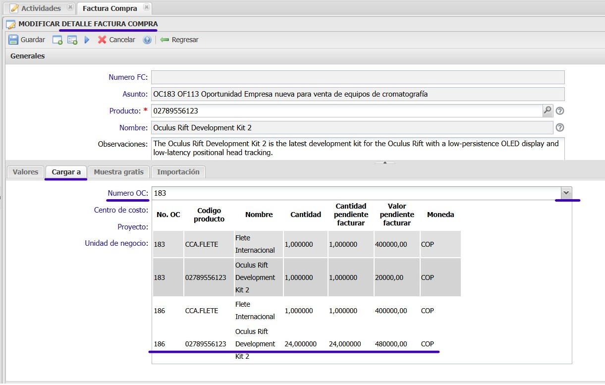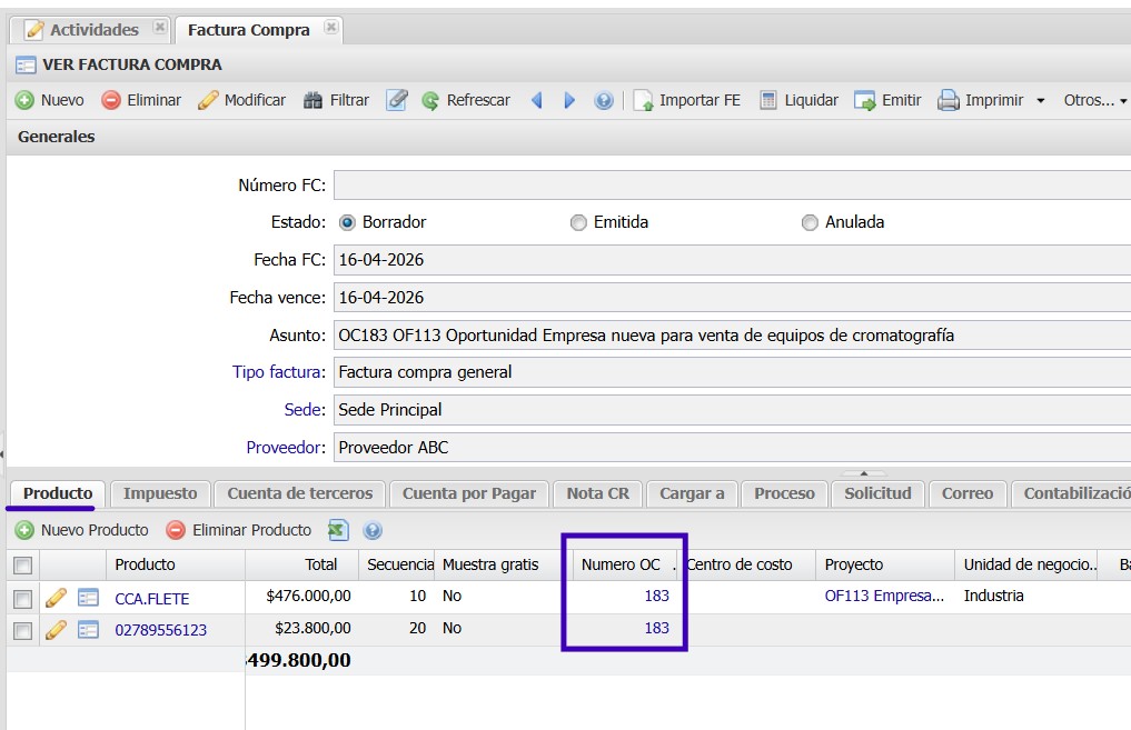 También puede suceder que el sistema asocie una línea de factura a una orden de compra distinta de la esperada. Esta asignación puede revisarse en la columna Número OC del panel Producto: